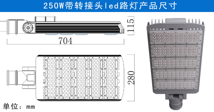 產(chǎn)品特點: 1.燈臂角度可180°調(diào)節(jié),照射角度可隨意變化 2.采用高亮度LED芯片,亮度高、顯色性好 3.鋁加工而成,對流散熱設(shè)計,散熱性能好,保障光源使用壽命 4.抗17級風(fēng)力,無形變、松動等現(xiàn)象,異常牢固 5.防護等級IP65 適用范圍: 主干道路、高速公路、高架路、市區(qū)街道、天橋、人行道等道路照明,以及廣場、學(xué)校、住宅區(qū)、工業(yè)區(qū)、公園等其他需要戶外照明的場所。 產(chǎn)品規(guī)格(Product Spec):PL29L-250W LED路燈